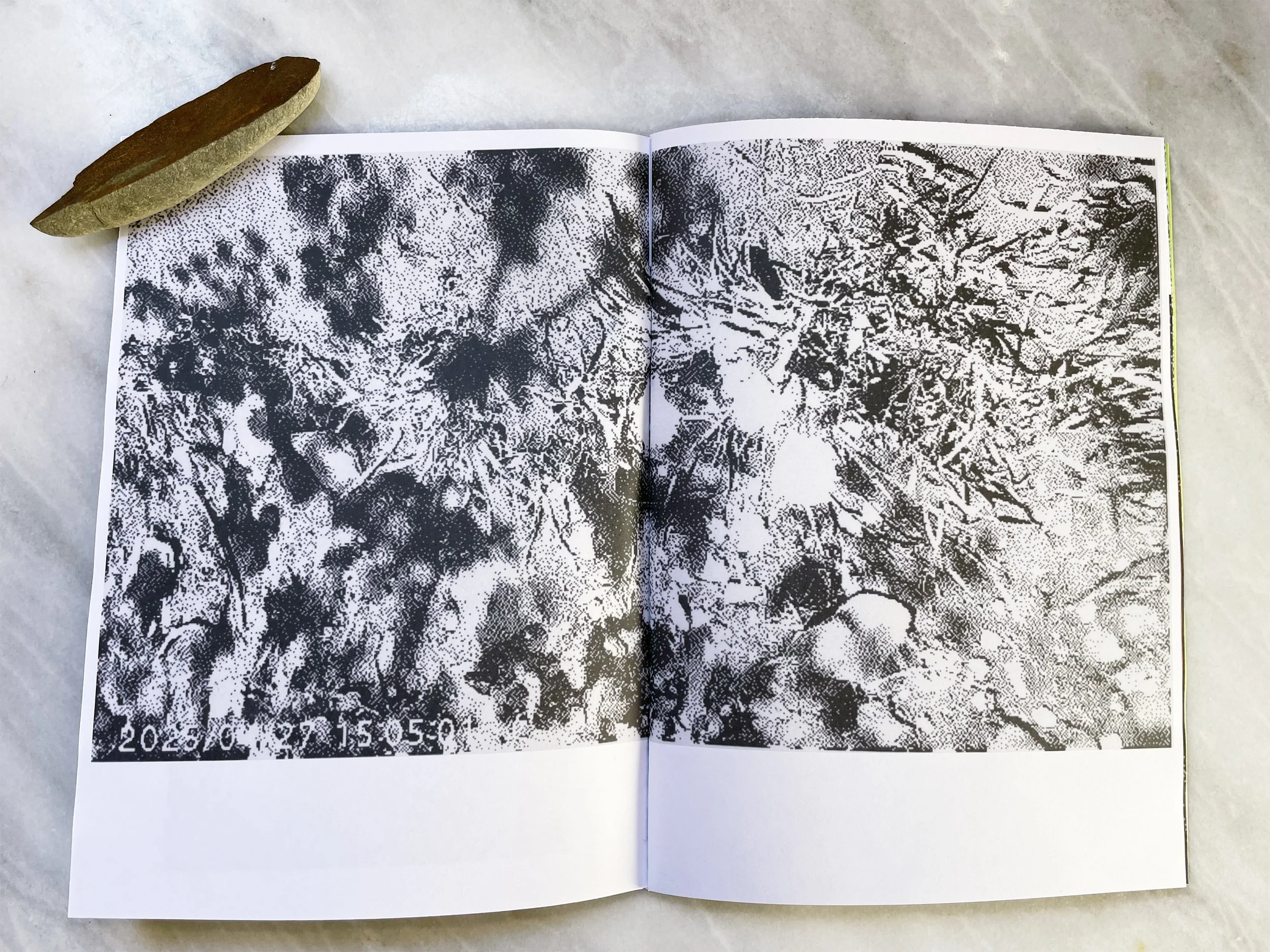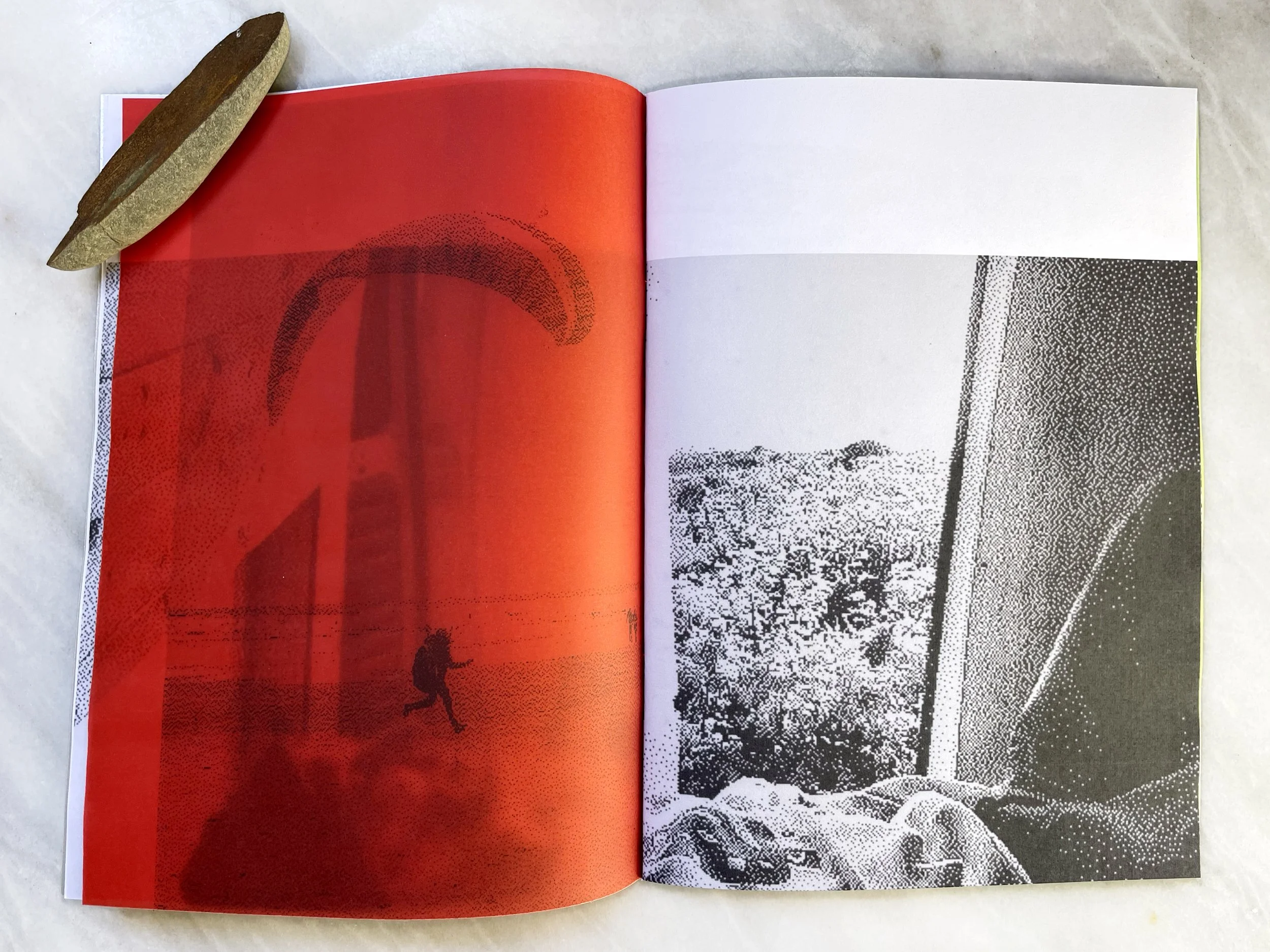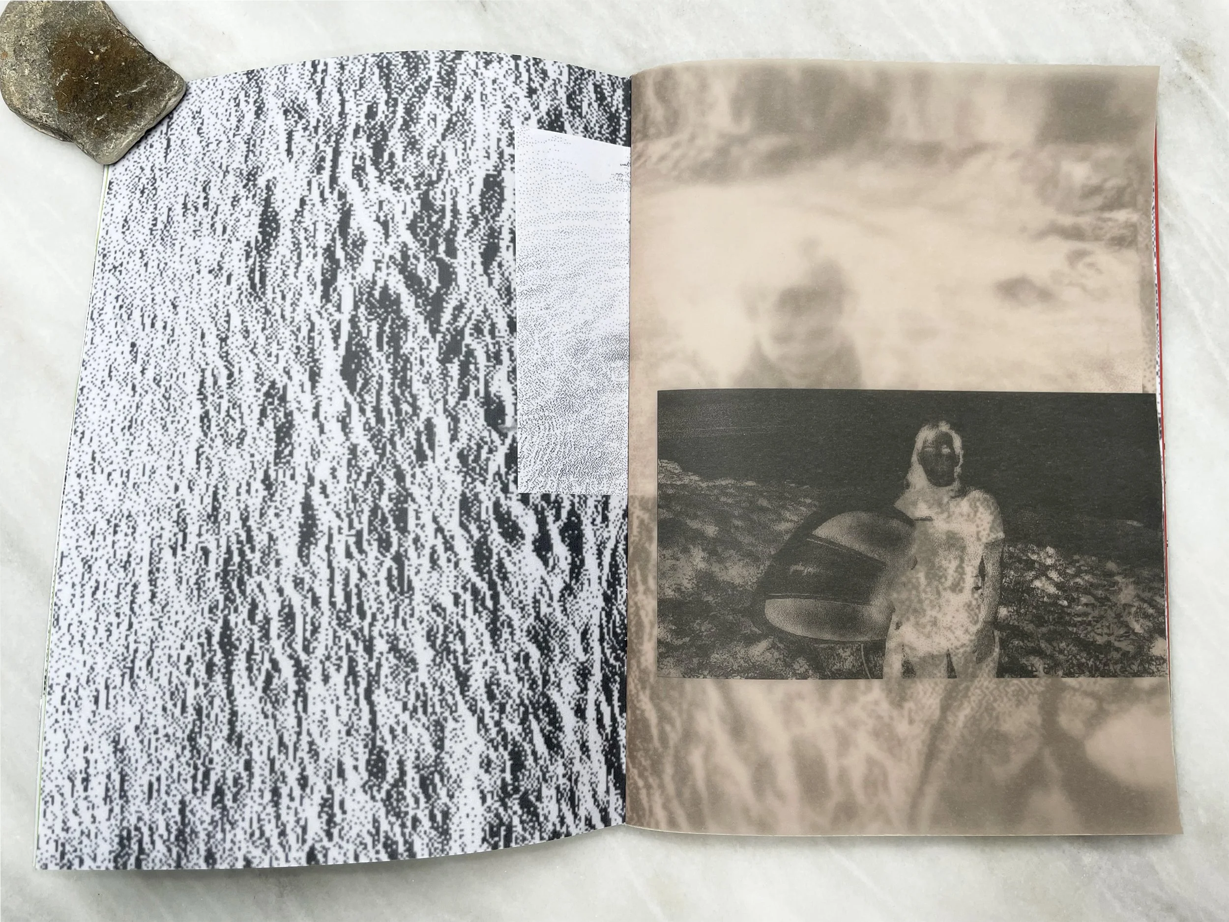 40 b&w pages on 80gsm uncoated paper, with metallic paper cover plus inserts on pink, red & acid green tracing paper, hand-sewn.